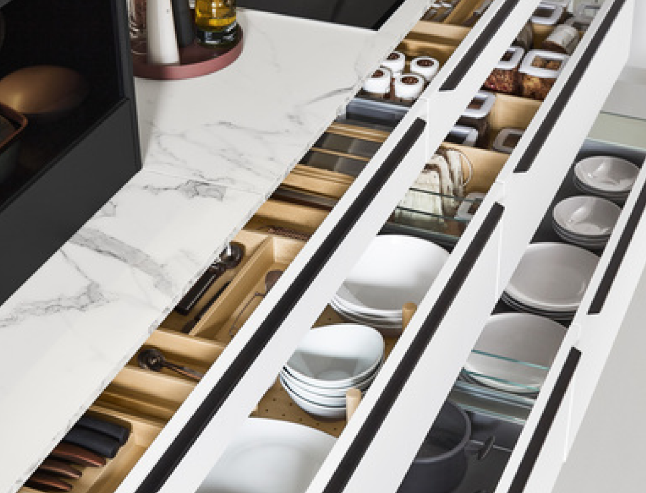 Nobilia Küchen bestechen durch clevere, platzsparende Innenaustattung und eine große Auswahl an Arbeitsplatten.