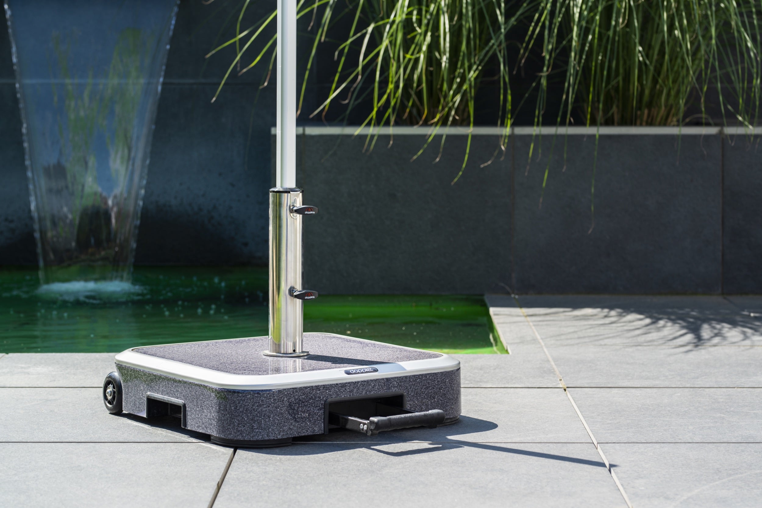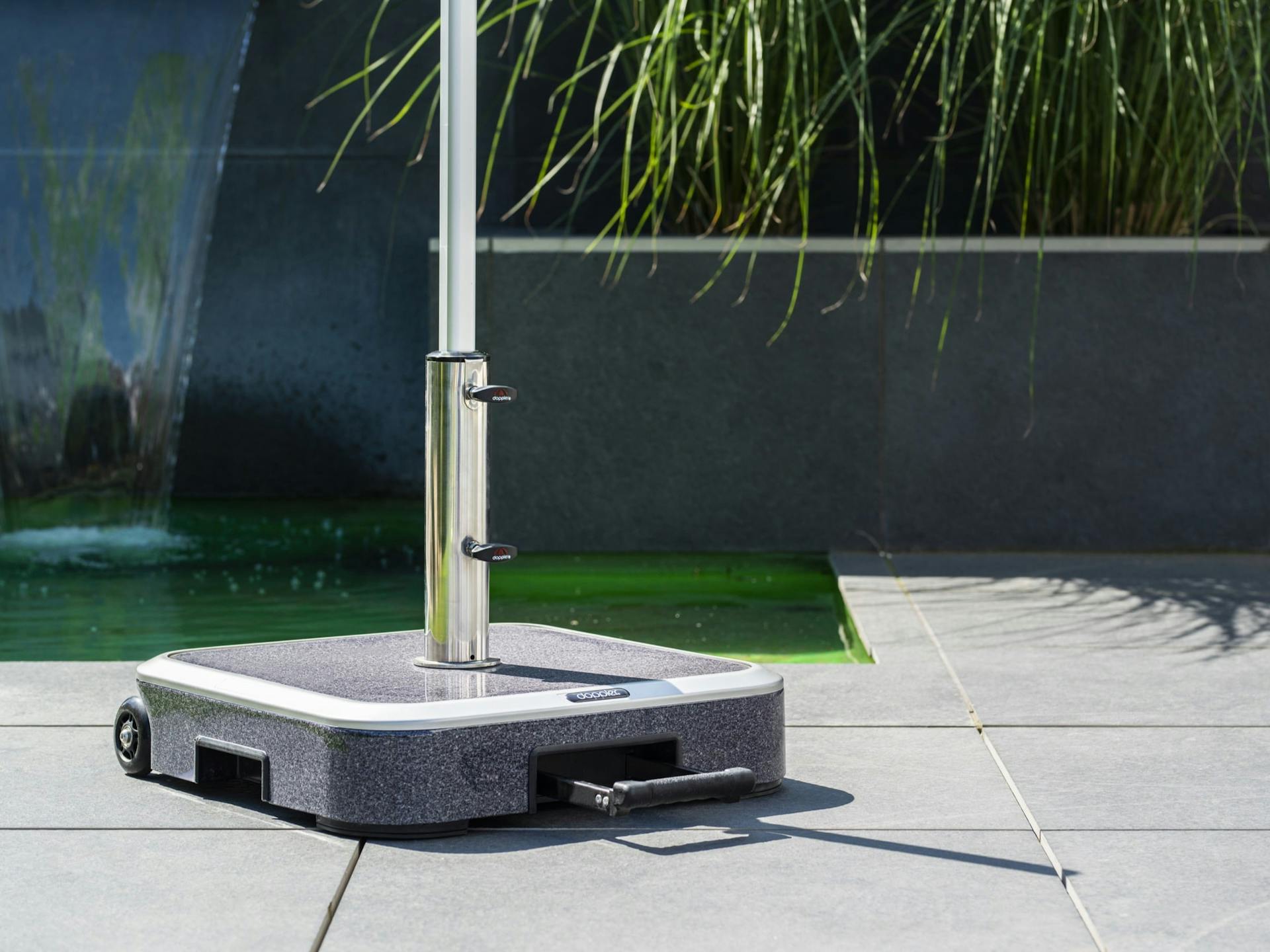Für eine bodenebene Befestigung auf Rasen oder Terrasse empfiehlt doppler Rasendorne oder Bodenanker. Hochwertige Granitsockel, Betonsockel mit Kunststoff-Ummantelung oder Füllsockel sorgen für einen sicheren Stand des Sonnenschirms.