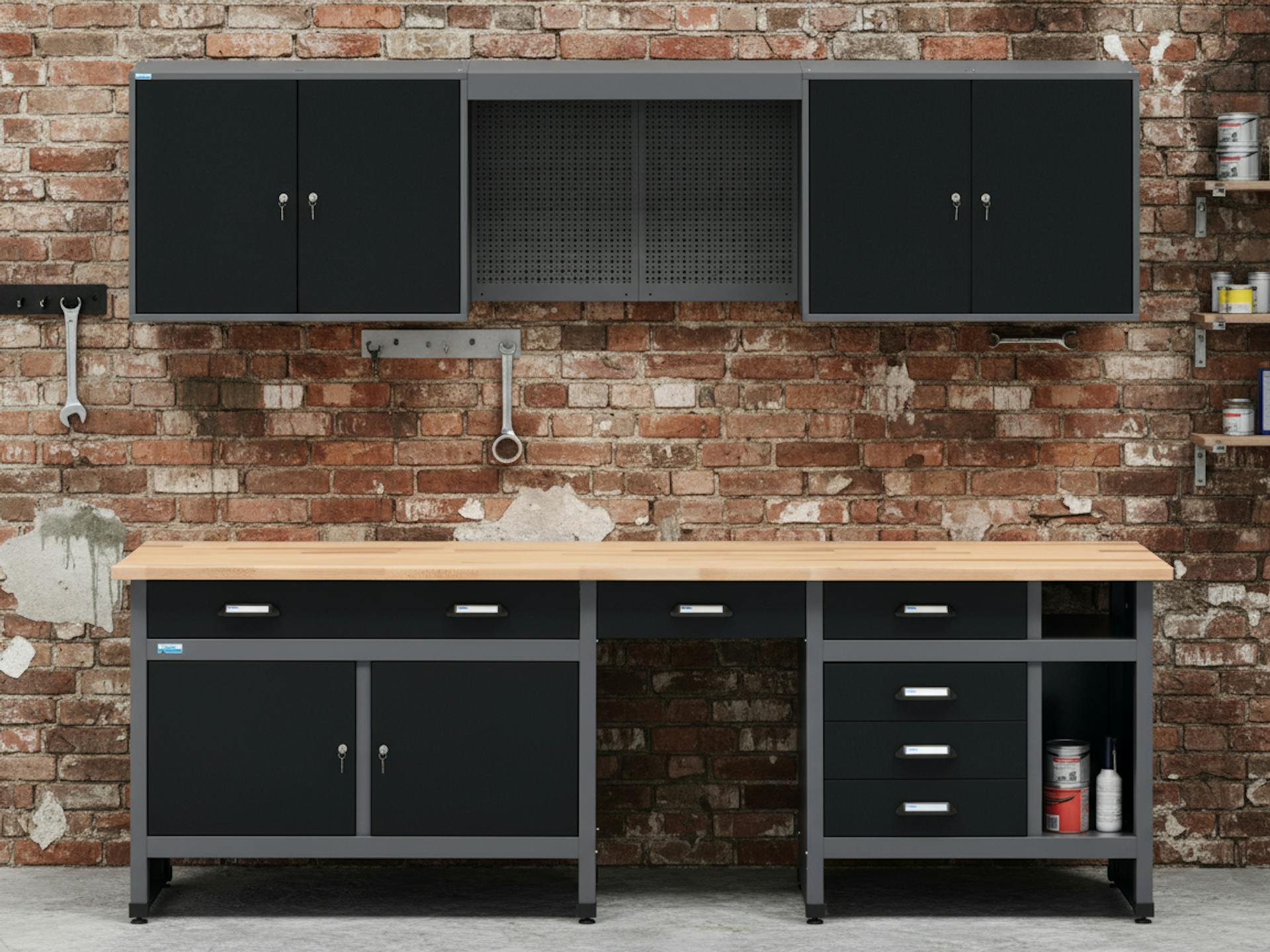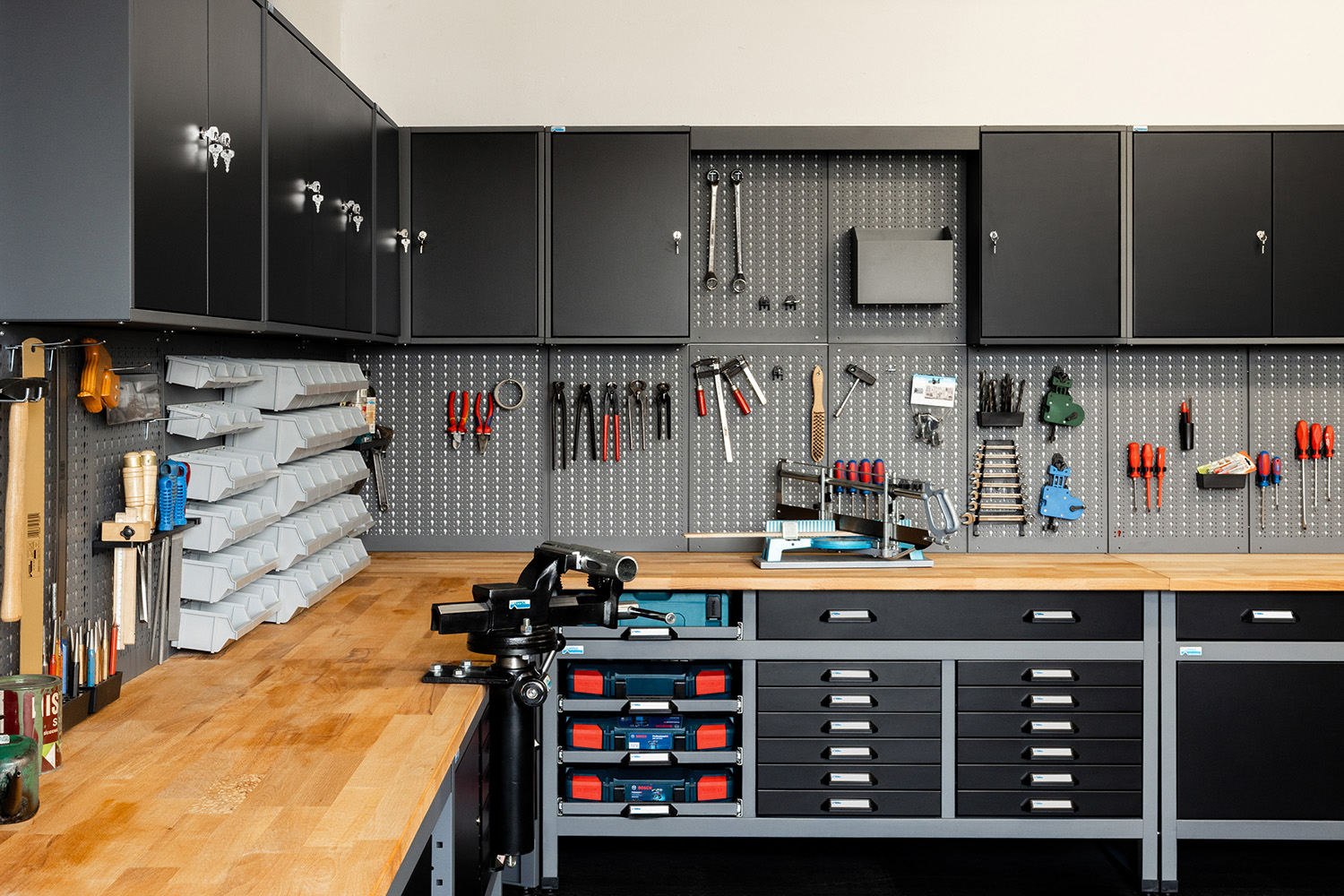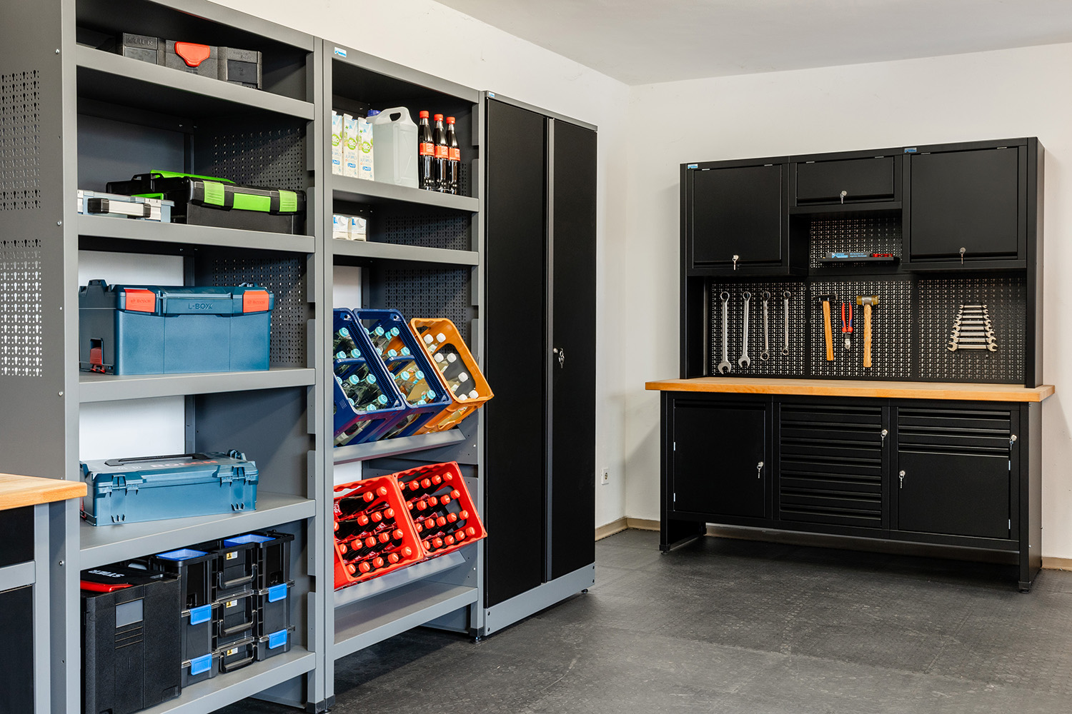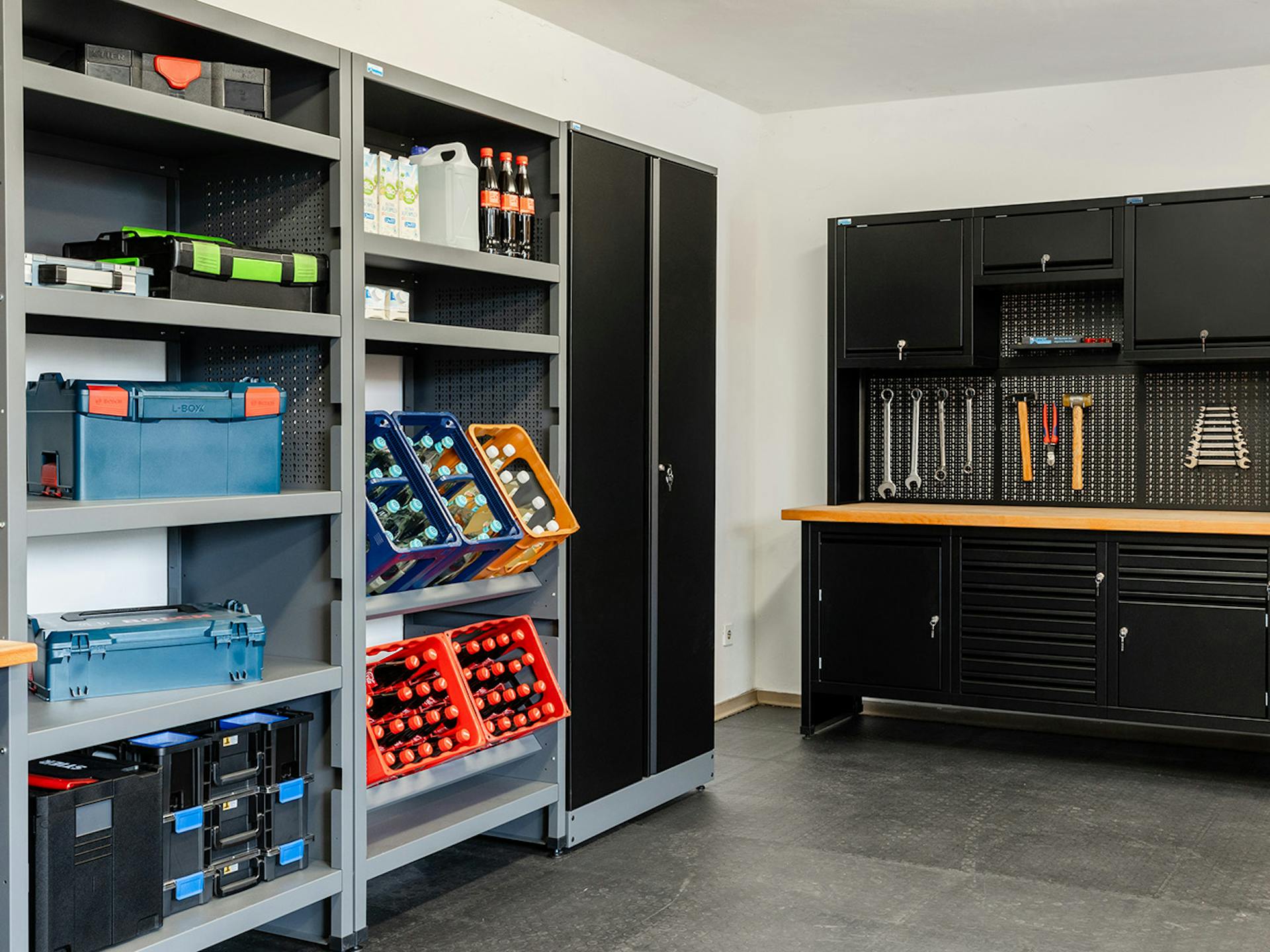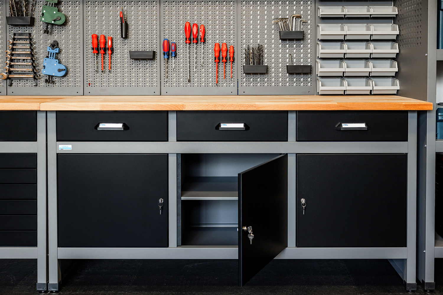 Die Küpper Hoch- und Standschränke bieten großzügigen Stauraum für größere Gegenstände. Einige Modelle verfügen ebenfalls über praktische Schubladen oder Lochwänder. So kannst du Elektrogeräte, Werkzeug und sonstige Kleinteile in deiner Werkstatt geordnet und sicher verstauen.
