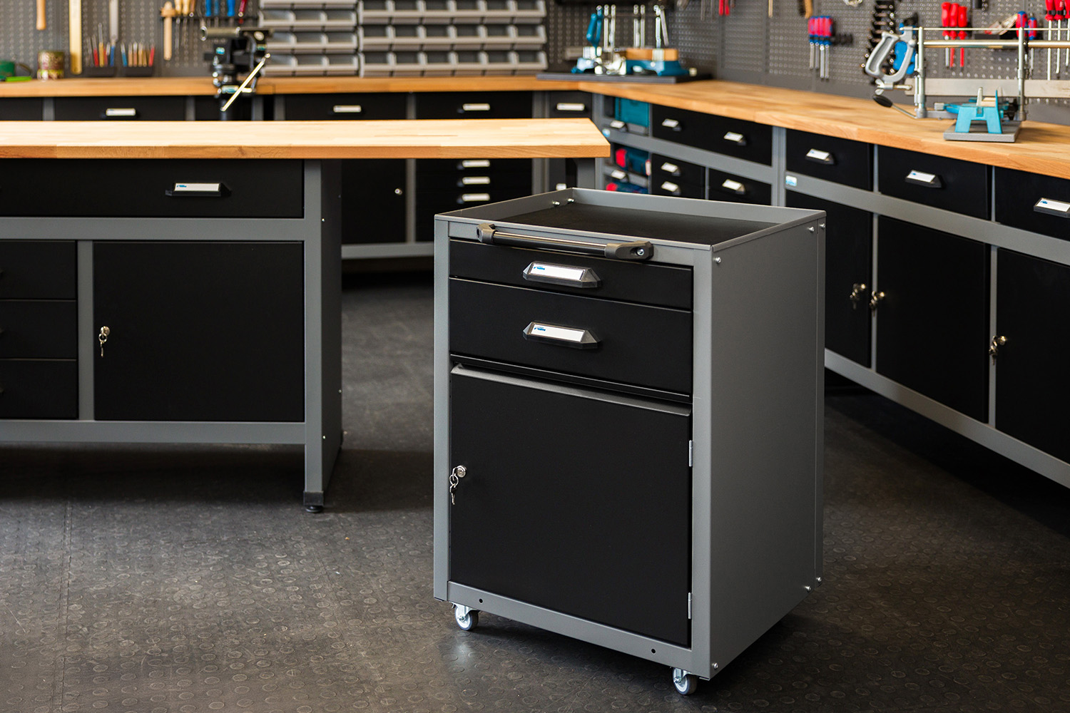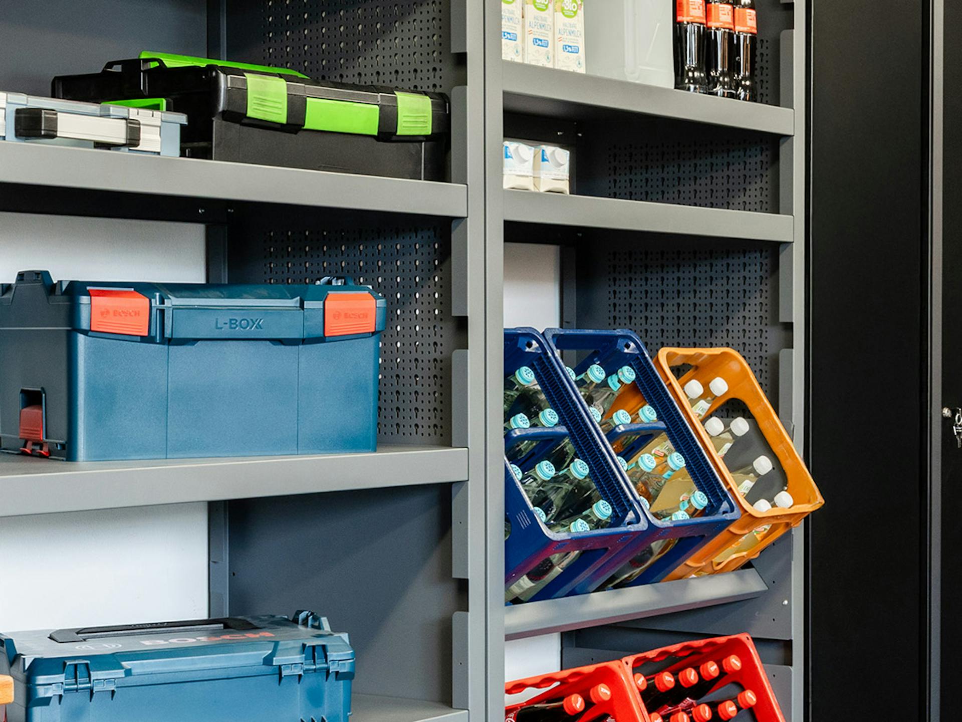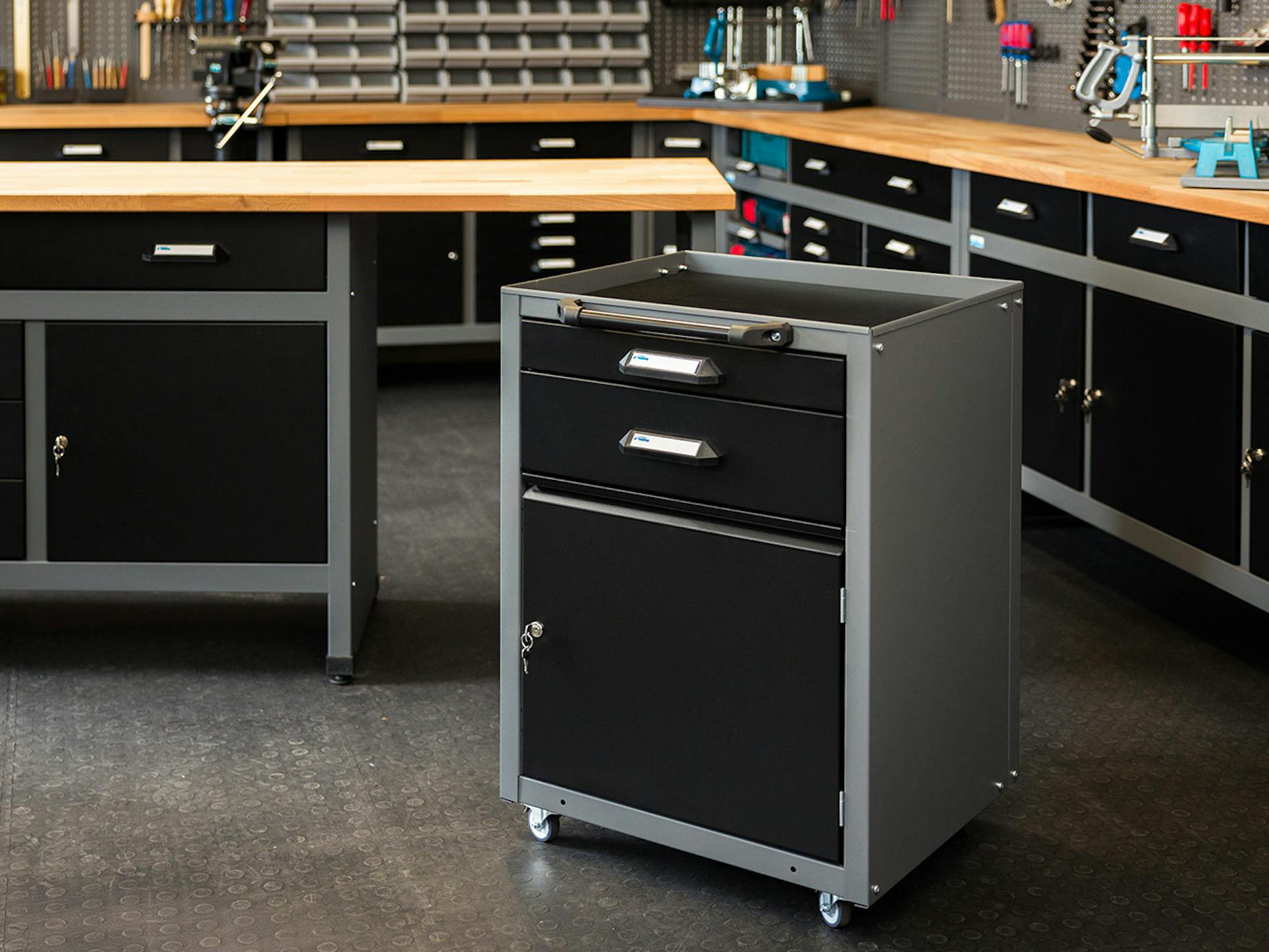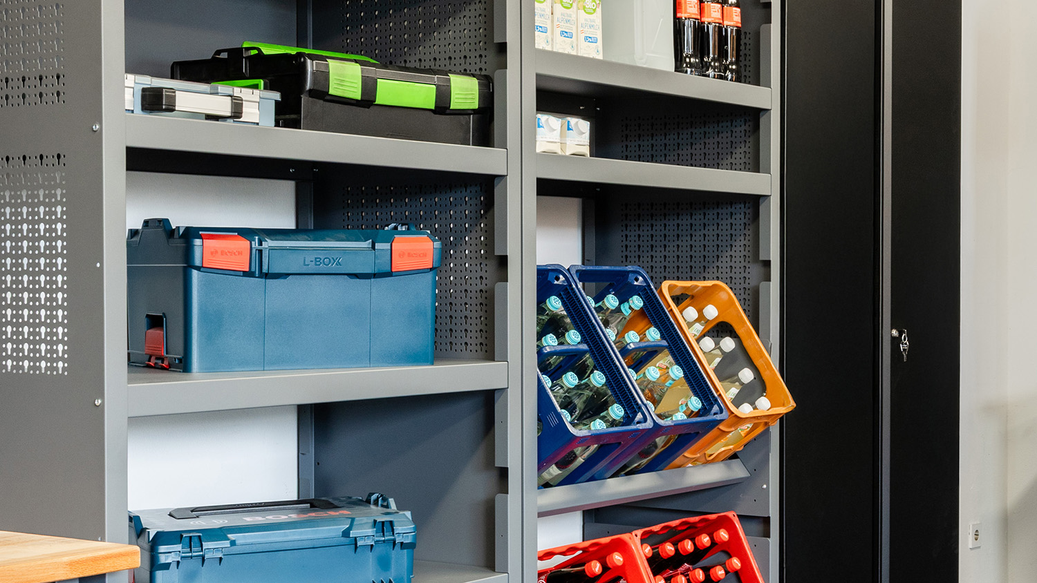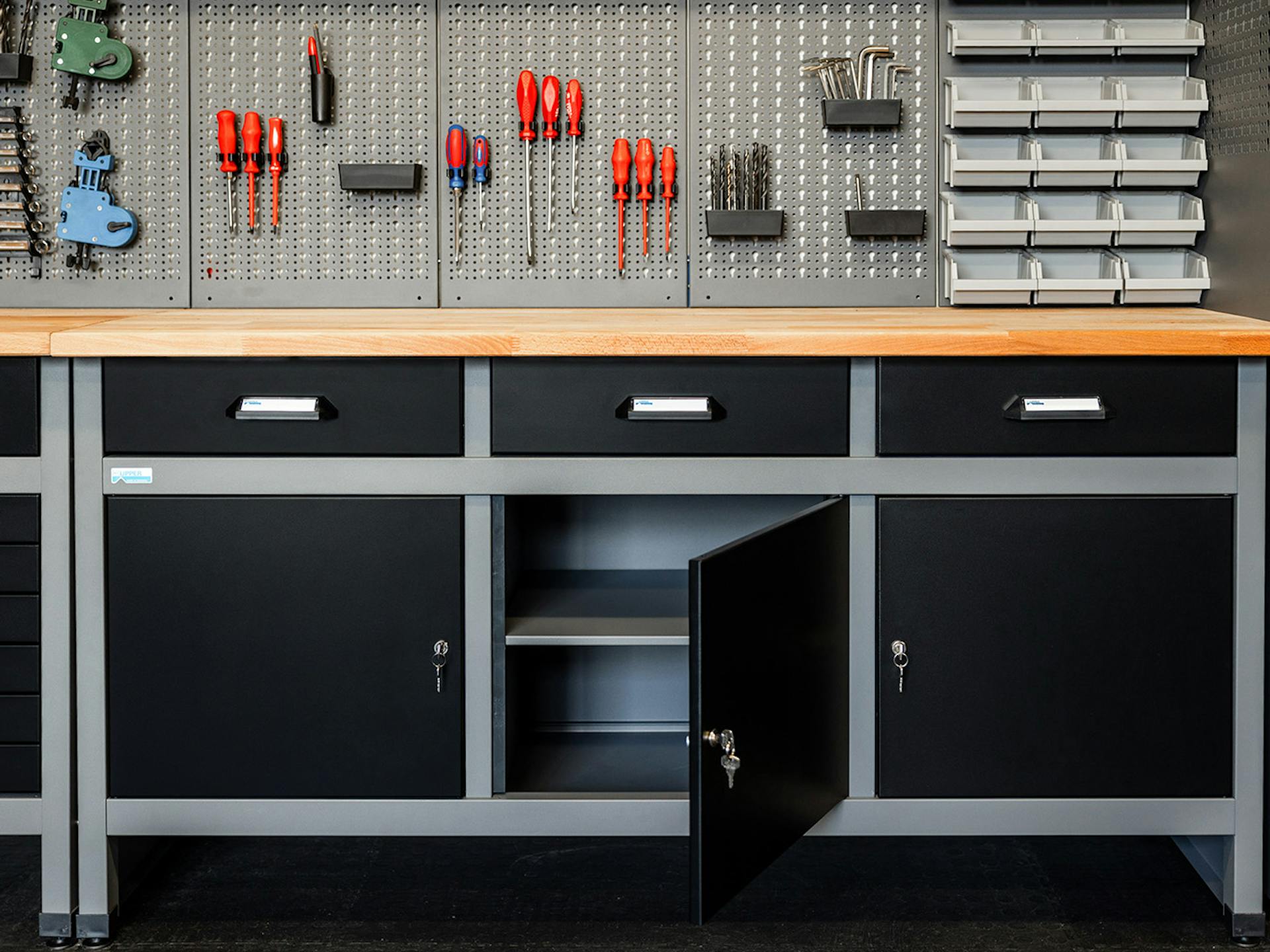 Die abschließbaren Doppelflügeltüren bieten einen einfachen Zugriff auf den gesamten Werkzeugschrank. Ergänze deine Werkstatt außerdem mit Regalen von Küpper um Material und Produkte noch schneller griffbereit zu haben.