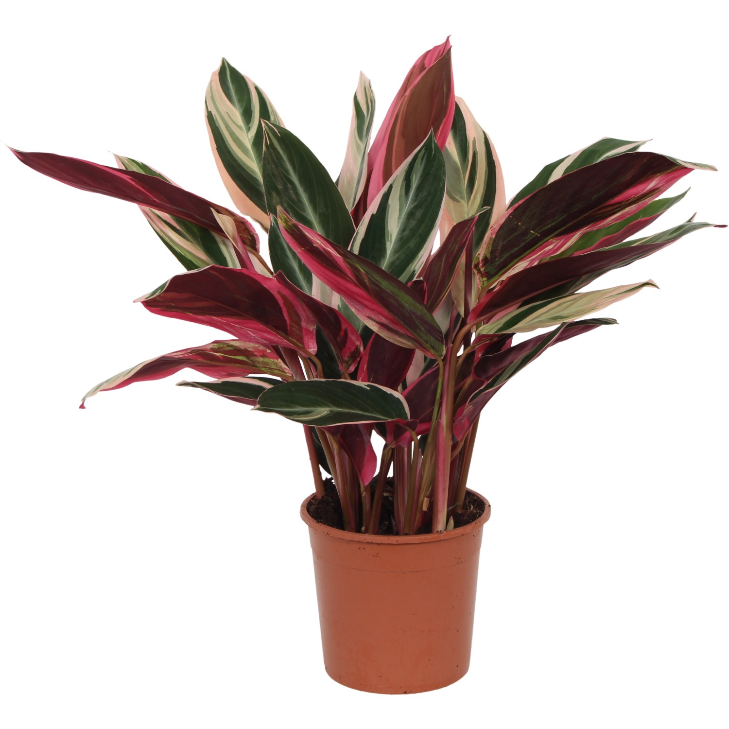 Die Korbmarante "Triostar" (Calathea Stromanthe sanguinea) ist eine tropische Blattschmuckpflanze. Ihre auffallend schöne Blattzeichnung und längliche Form der Blätter machen die Korbmarante zu einer außergewöhnlichen Zimmerpflanze. Bei guter Pflege bildet sie gelbe, röhrenförmige Blüten, die in schönen Ähren angeordnet sind. Wenn es dunkel wird, rollen sich die Blattränder der Pflanze nach innen. Sie mag halbschattige Standorte ohne direkte Sonneneinstrahlung. Temperaturen zwischen 20°C und 25°C sind ideal. Auch regelmäßiges Gießen ist wichtig, sodass die Erde stets feucht bleibt. Im Sommer, bei höheren Temperaturen, zusätzlich mit Wasser besprühen, da die Korbmarante hohe Luftfeuchtigkeit mag. Über die Winterzeit sollten 15°C nicht dauerhaft unterschritten werden. Ballentrockenheit und Staunässe vermeiden. Alle zwei Wochen düngen.