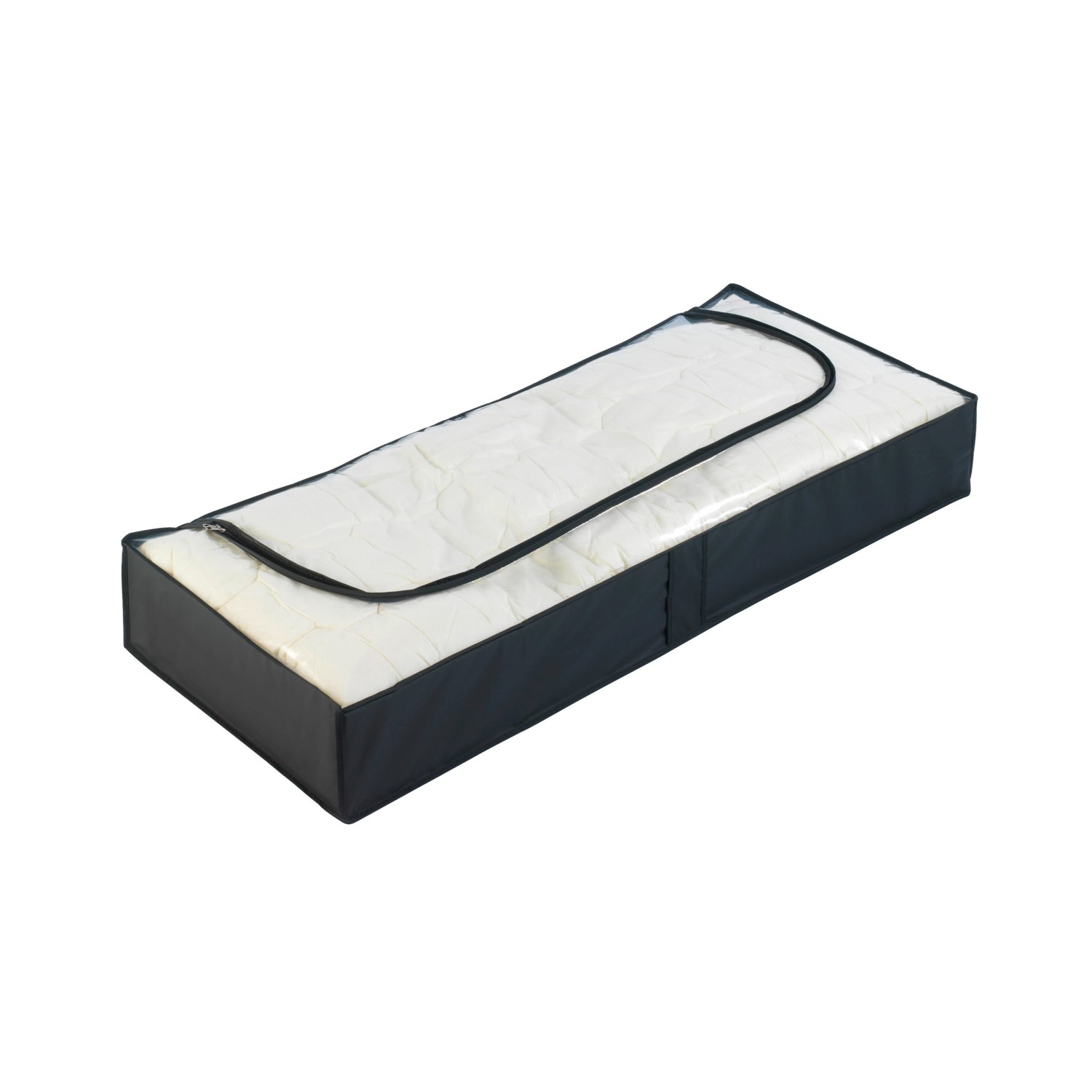 In der dekorativen Unterbettkommode Deep Black sind die Saisontextilien stets griffbereit. Platzsparend können Sommer- bzw. Winterkleider in dem flachen Raumwunder ordentlich und trocken verpackt und dabei geschützt vor Staub unter dem Bett, in oder auf dem Schrank aufbewahrt werden. Die transparente Oberseite sorgt für einen schnellen Überblick auf den Inhalt, ohne die Kommode zu öffnen. Durch den praktischen 3-Seiten-Reißverschluß kann die Kommode jederzeit leicht geöffnet und wieder geschlossen werden. Das pflegeleichte Material PEVA der Deep Black-Serie ist bei Bedarf einfach abwaschbar. Material: Kunststofffilm (PEVA)/PP Abgebildete Dekorationen sind nicht im Lieferumfang enthalten.