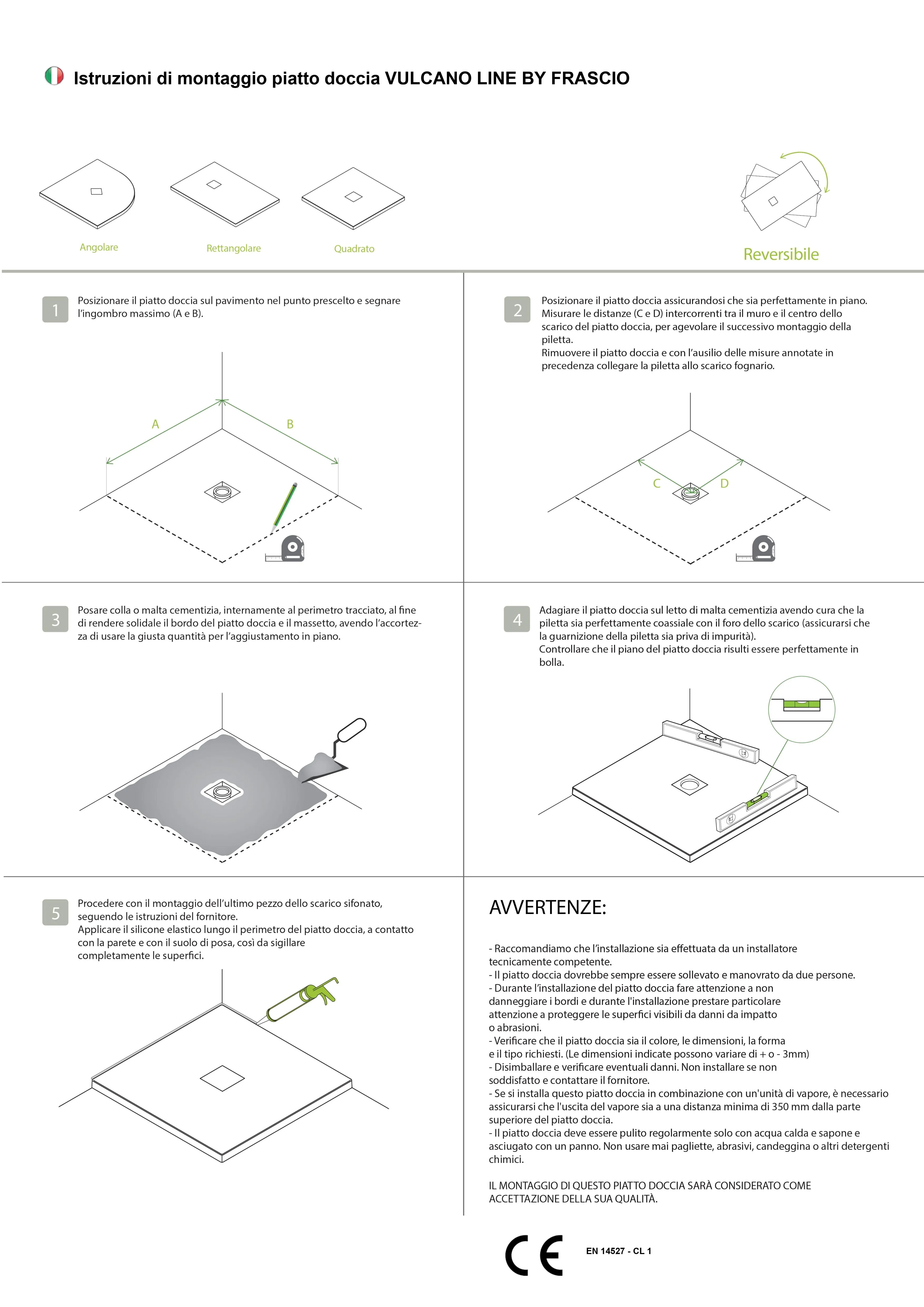 Die Duschwanne wird auf Bodenebene installiert und kann sowohl traditionell, als auch in den Boden eingesenkt, aufgebaut werden. Dank des flachen Designs entsteht, bei der traditionellen Installation, eine Stufe von 3 cm. Für einen zuverlässigen Wasserabfluss sorgt das integrierte Gefälle. Dadurch lässt sich auch eine Reinigung leicht durchführen, wofür nur normale Neutralseife gebraucht wird.