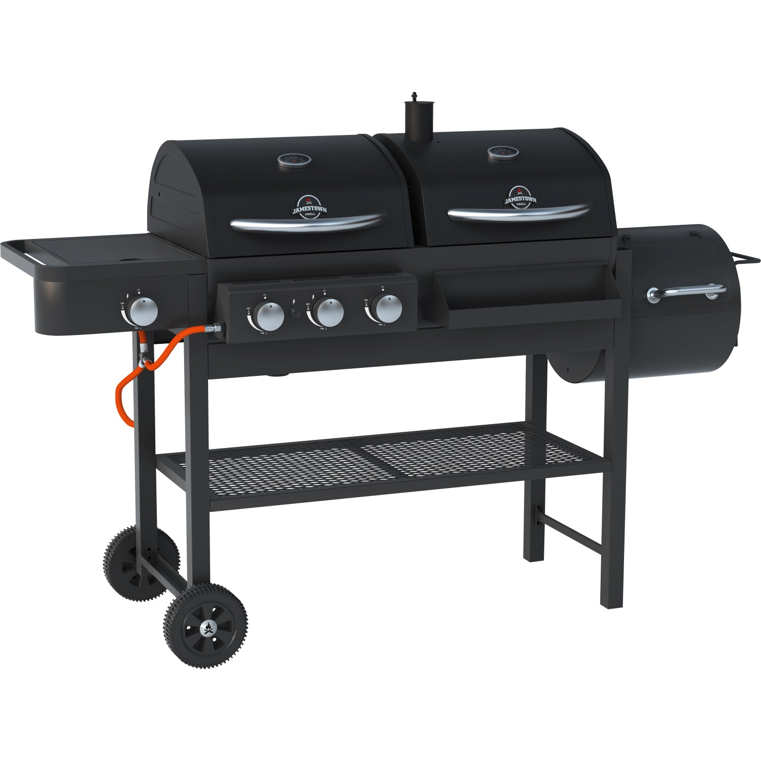 Grillen ist ehrlich. Grillen ist ursprünglich. Beim Grillen geht es nicht um die große Show, sondern einfach nur um eine gute Zeit. Alles, was du dafür brauchst, sind gute Freunde, die Familie, passende Zutaten - und einen guten Grill. Deshalb gibt es Jamestown: die Grillmarke für Kenner und Genießer. Dieser 3 in 1 Grill mit einer Kombination aus Gas - und Holzkohlegrill und Smokerbox bietet dir echte Qualität und Vielfalt. Er ist hervorragend verarbeitet und dabei leicht zu bedienen. Der Deckel hält Temperatur und Raucharomen in der Garkammer und sorgt so für ein köstliches Festmahl. So gelingen dir auch saftige Braten oder Rippchen bei indirekter Hitze. Darüber hinaus besitzt er zwei Grillroste aus Gusseisen und einen praktischen Warmhalterost.