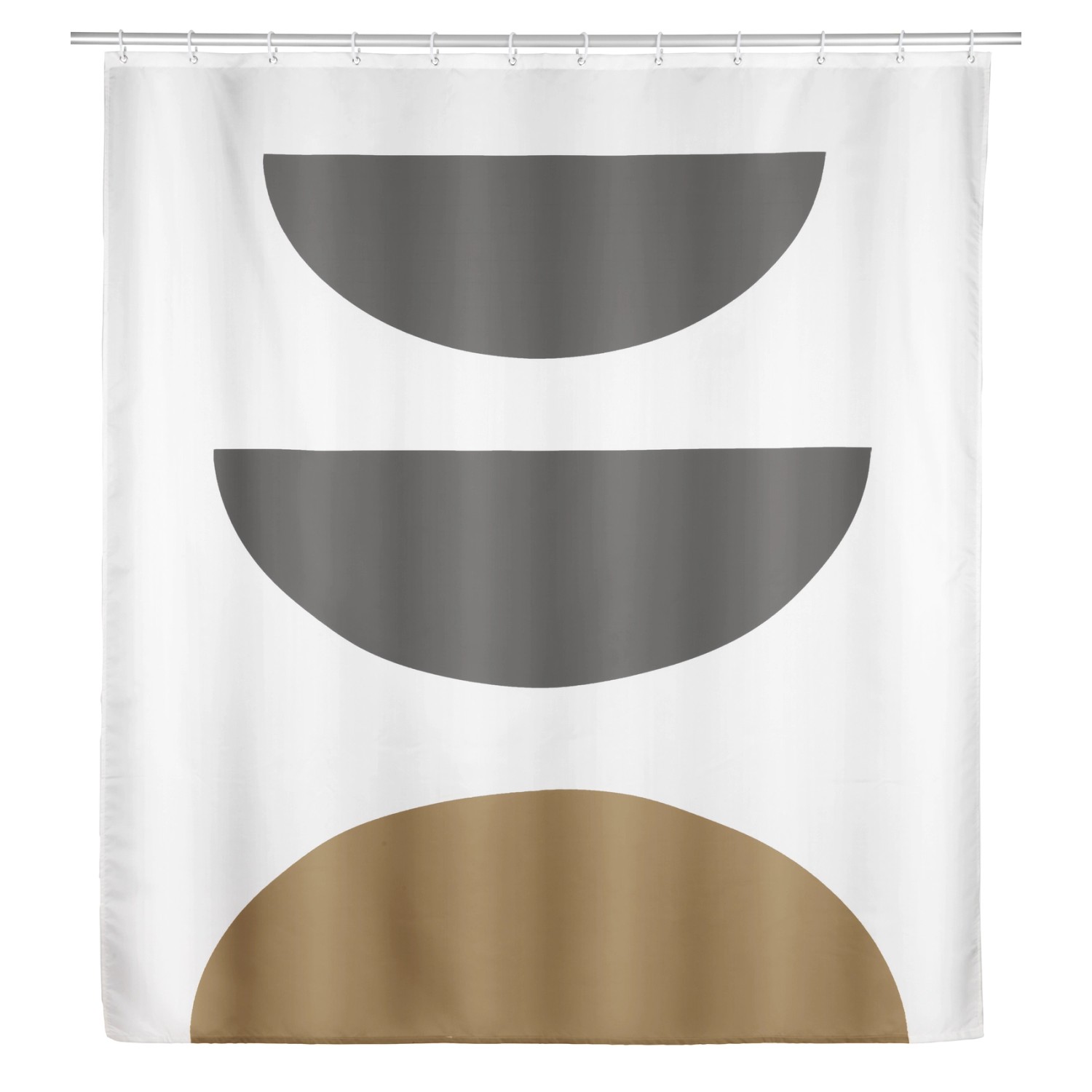 Der Duschvorhang Mahan schafft durch sein abstraktes Motiv mit halbrunden Elementen in Grau- und Beigetönen eine moderne Atmosphäre mit künstlerischem Touch. Der Textil-Vorhang besteht aus strapazierfähigem Polyester.