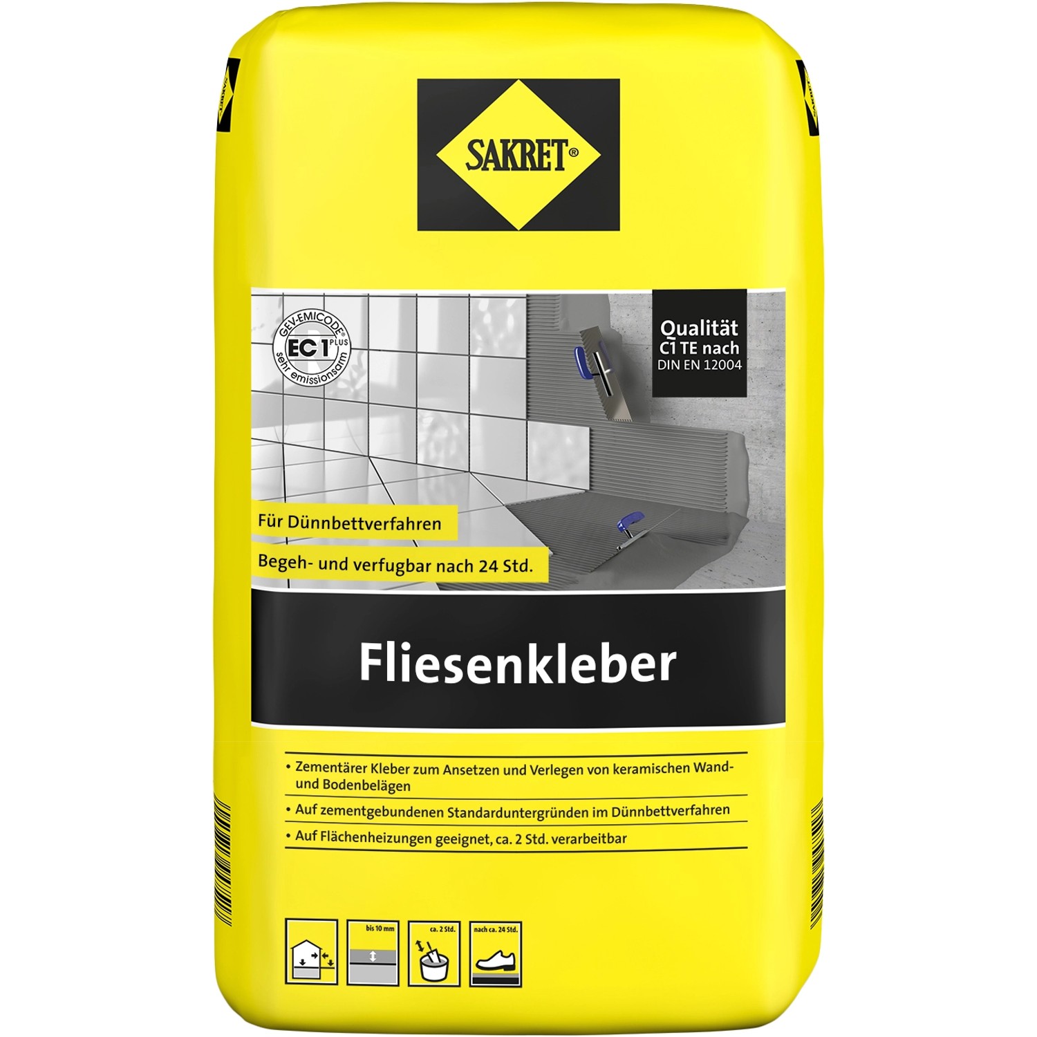 Sakret Fliesenkleber ist ein zementgebundener Fliesenkleber zum Verlegen von keramischen Fliesen- und Plattenbelägen im Dünnbettverfahren (nur auf zementgebundenen Untergründen).