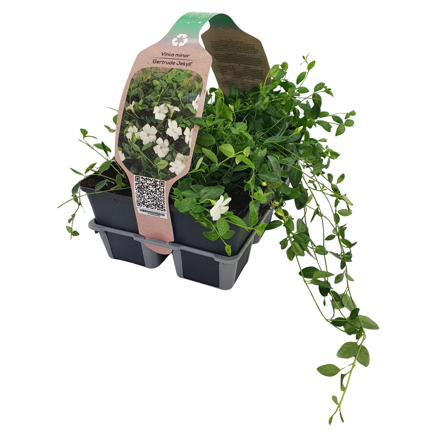 Das Kleinblättrige Immergrün "Gertrude Jekyll" (Vinca minor) ist ein niedrig wachsender Bodendecker, der teppichartig wächst und Ausläufer bildet. Die Pflanzen wachsen relativ langsam und erreichen eine Höhe von ca. 15 bis 20 cm.
