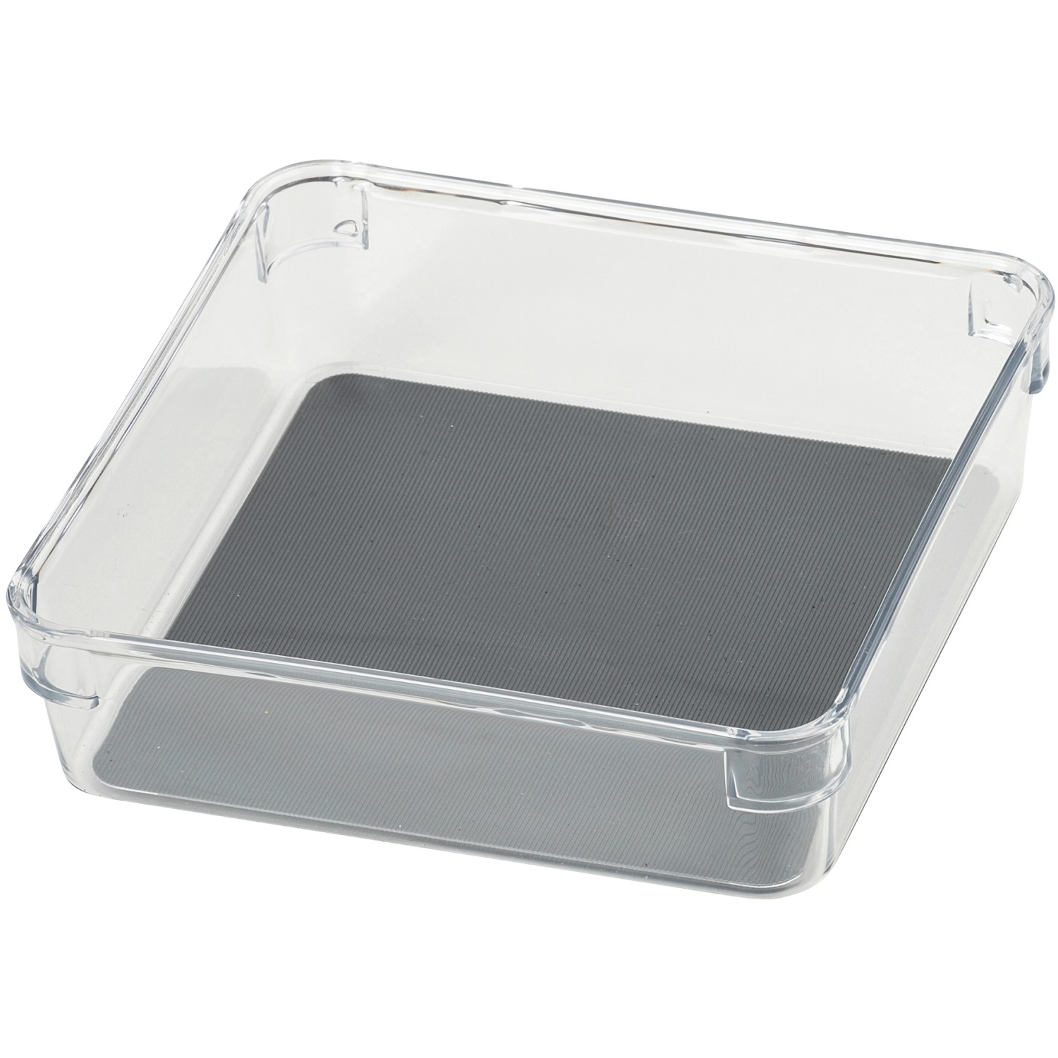 Im modernen Design aus hochwertigem grau-transparentem Kunststoff gefertigt passt die quadratische Box in jede handelsübliche Schublade.