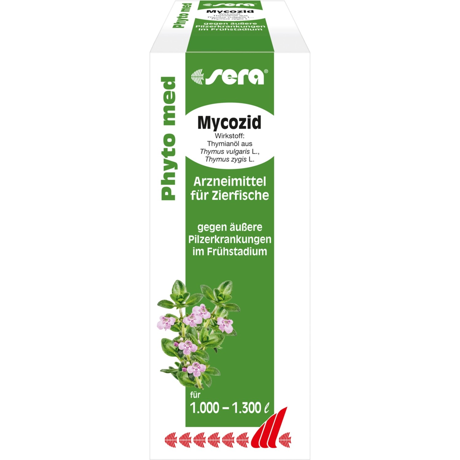 Das Sera pflanzliche Arzneimittel Phyto med Mycozid enthält als Wirkstoff hochwirksames Thymianöl aus Thymus vulgaris L., Thymus zygis L. wodurch es gegen äußere Pilze wie Saprolegnia sp., Achlya sp. im Frühstadium sowie Laichverpilzung wirkt. Zudem kann es therapiebegleitend bei Verletzungen oder bakteriellen Entzündungen eingesetzt werden, um einer sekundären Pilzinfektion vorzubeugen.