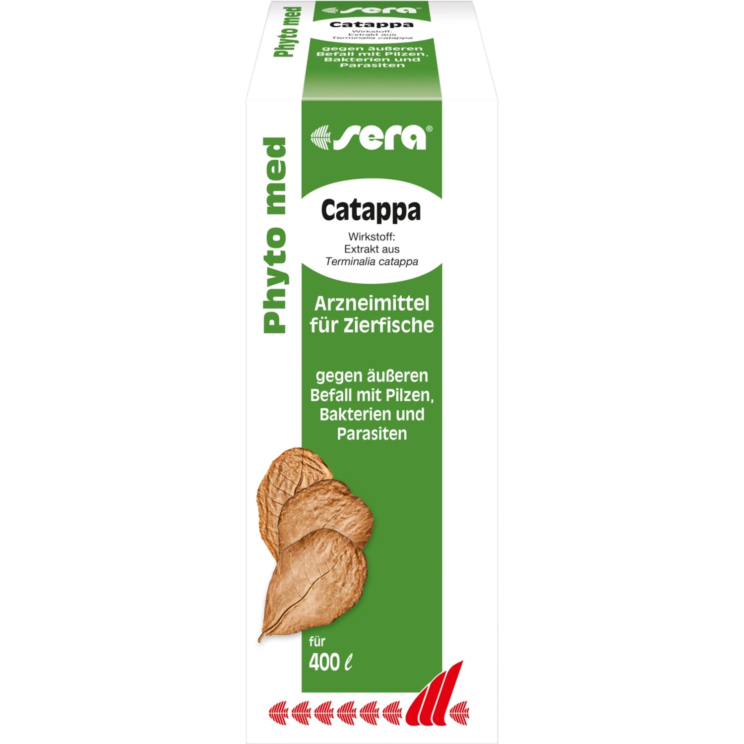 Das Sera pflanliche Arzneimittel für Aquaristik Phyto med Catappa enthält als Wirkstoff einen Extrakt aus Seemandelbaumblättern (Terminalia catappa) gegen Pilze, Bakterien und Ektoparasiten. Es ist das erste Medikament für die Aquaristik auf Basis von Catappa-Blättern. Durch das neue, einzigartige von sera entwickelte Extraktionsverfahren wird das Maximum der medizinisch wirksamen Substanzen aus den Blättern gelöst. sera Phyto med Catappa wirkt durch den speziellen Wirkstoffvermittler schneller. Im Vergleich mit normalen Extrakten oder der reinen Zugabe von Catappa-Blättern wirkt sera Phyto med Catappa bis zu 4 Mal stärker.