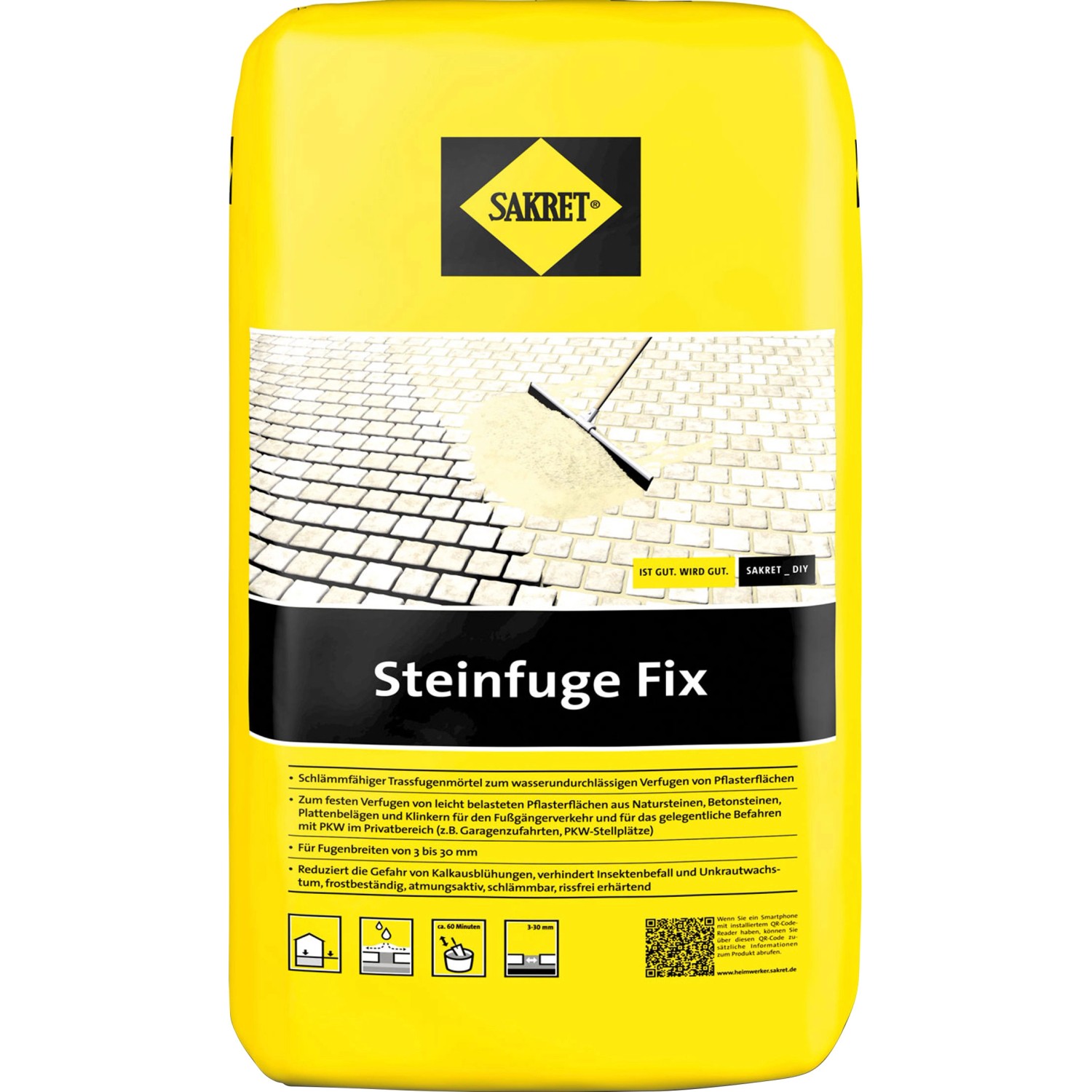 Sakret Steinfuge Fix ist ein schlämmfähiger, trass-zementgebundener Fugenmörtel für Fugenbreiten von 3 - 30 mm zum wasserundurchlässigen, festen Verfugen von leicht belasteten Alt- oder Neupflasterflächen aus Natursteinen, Betonsteinen, Plattenbelägen und Klinkern für den Fußgängerverkehr und für das gelegentliche Befahren mit PKW im Privatbereich (z.B. Garagenzufahrten, PKW-Stellplätze).