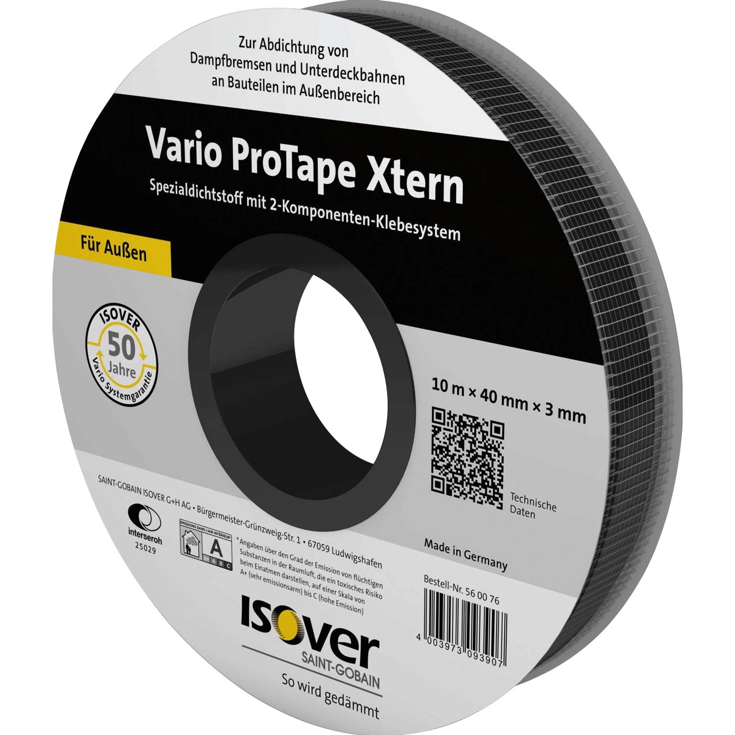 Mit dem Isover Klebeband ProTape Xtern lassen sich dauerhafte Verklebungen von Dampfbremsen und Unterdeckbahnen an angrenzenden Bauteilen im Außenbereich unkompliziert und doppelt so schnell herstellen. Durch das neue Zwei-Kleber-System ist Vario ProTape Xtern perfekt auf alle bauüblichen Untergründe abgestimmt. Die extra dicke Isobutenkautschuk-Raupe an der Unterseite garantiert eine starke Haftung auch auf unebenen Bauteilen, während der Acrylat-Kontaktkleber an der Oberseite dauerhaft luftdichte Verbindungen zu Dampfbremsfolien und Unterdeckbahnen gewährleistet.
