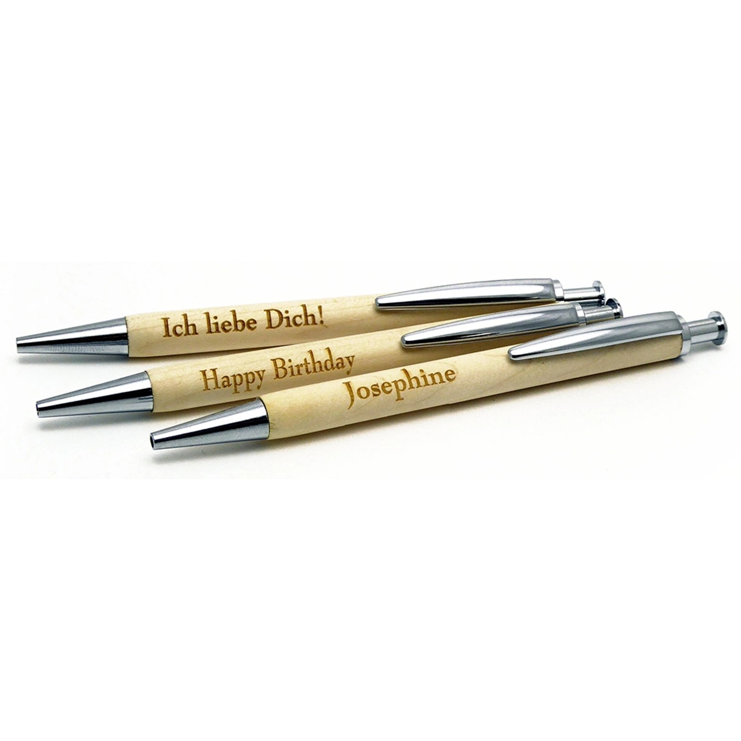 Der Holzkugelschreiber mit den Maßen 15 cm x 1,5 cm ist mit einer Präzisions-Lasergravur versehen. Sie sind verfügbar in 288 Männer- und Frauen Vornamen und 96 Sprüchen. Der Kugelschreiber ist aus Birkenholz hergestellt und verfügt über eine Großraummine in blauer Schriftfarbe inkl. Metallclip und Metallspitze für lange Haltbarkeit. Der Kugelschreiber ist ideal geeignet als Geschenk und Mitbringsel für jeden Anlass.