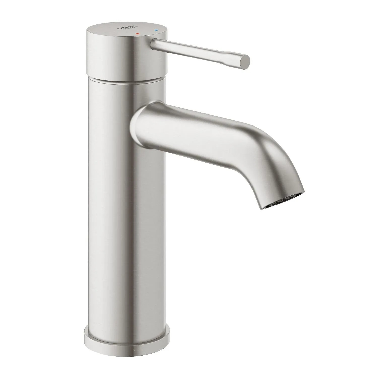 Die Grohe Essence Einhand-Waschtischarmatur mit hohem Auslauf in der Farbvariante Supersteel verfügt über einen unverkennbaren Zylinder.